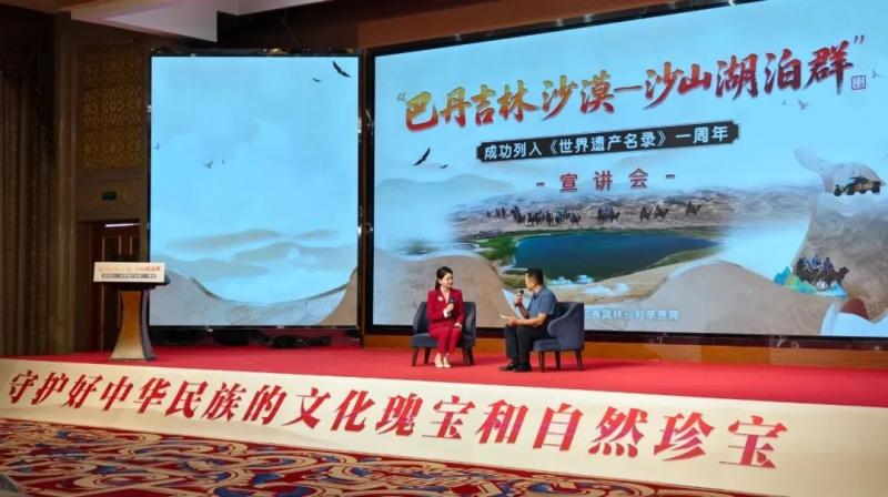 宣講會上,知名專家、一線工作者、志愿服務(wù)隊代表等宣講嘉賓和文旅從業(yè)者齊聚一堂,通過主題宣講、人物訪談的形式,共同回顧了“巴丹吉林沙漠—沙山湖泊群”申遺成功一周年以來的保護(hù)成果,立體展現(xiàn)了巴丹吉林沙漠的生態(tài)價值、保護(hù)實踐與時代意義,探討這片世界自然遺產(chǎn)的未來發(fā)展之路。