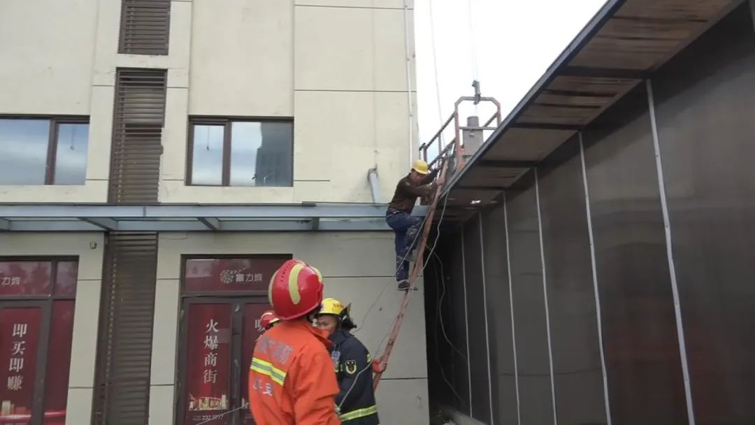 指揮員立即命令第一營救小組前往建筑內(nèi)部,試圖通過住戶窗戶進(jìn)行營救,當(dāng)營救小組到達(dá)指定位置后發(fā)現(xiàn),消防隊(duì)員與被困工人相距太遠(yuǎn),空中營救的危險(xiǎn)性和困難程度較高。消防隊(duì)員通過與被困工人交流,提醒他抓好繩索,安撫他的情緒。很快,第二組營救的消防隊(duì)員利用掛鉤梯爬到二層位置把纏繞的鋼絲繩拉到地面,4人分別拽一根鋼絲繩,松解纏繞的鋼絲繩,使升降機(jī)恢復(fù)運(yùn)行。而此時(shí),天氣逐漸放晴,風(fēng)力也開始減弱,在消防隊(duì)員們的努力下,升降機(jī)緩緩下降,18時(shí)12分,被困的工人安全降落到地面。