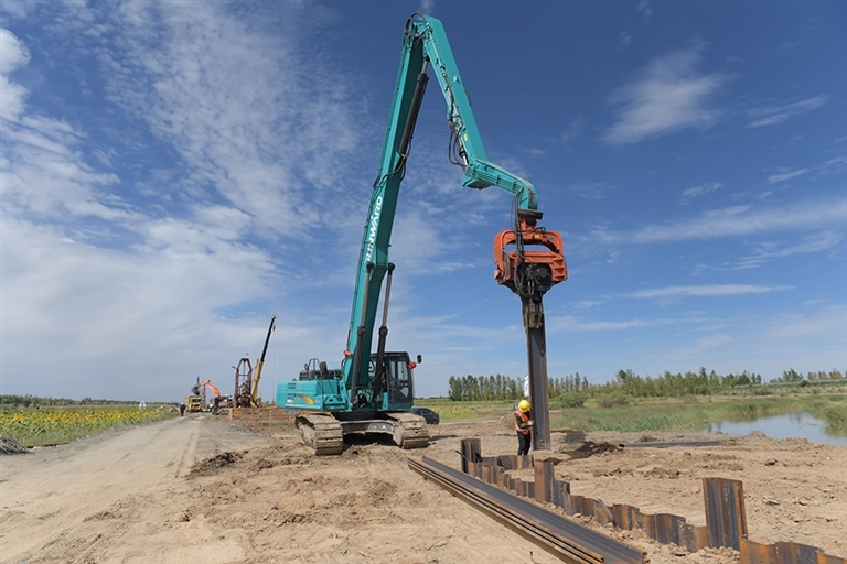 8月26日,記者在中鐵二十五局包銀高鐵工程軟基處理施工現(xiàn)場(chǎng)看到,各類(lèi)工程車(chē)輛往來(lái)穿梭,大型機(jī)械轟鳴作業(yè),頭戴安全帽的工人們?cè)诟髯詬徫簧嫌行蜃鳂I(yè)。