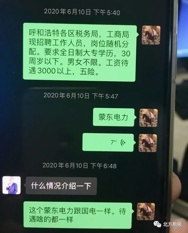 “呼和浩特各區(qū)消防大隊(duì)招聘辦公室內(nèi)勤人員,工資待遇3500元左右。”“高速交警呼市支隊(duì)(一支隊(duì))輔警,工資和五險(xiǎn)一金,4200元?!薄昂艉秃铺馗鲄^(qū)稅務(wù)局、工商局現(xiàn)招聘工作人員,崗位隨機(jī)分配?!薄昂艉秃铺貗D幼保健院招聘護(hù)士,大專(zhuān)學(xué)歷”……記者在民警繳獲的程某某的手機(jī)上看到,6月8日以來(lái),程某某和趙某某的聊天記錄中,發(fā)送了多條諸如此類(lèi)的招聘信息。