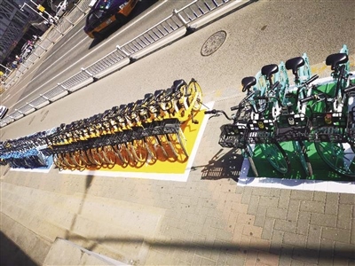 7月23日上午,記者來到呼和浩特火車站門前,遠(yuǎn)遠(yuǎn)就被火車站東側(cè)馬路道牙上的多彩顏色所吸引。原來這里被畫上了藍(lán)色、綠色和黃色的停車區(qū)域,一排排各品牌共享單車也根據(jù)車身顏色有序停放著。