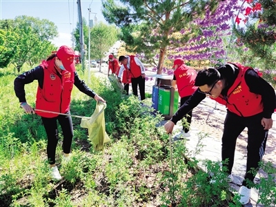 志愿者正在清理街道及綠化帶內的垃圾。 譚艷麗 攝