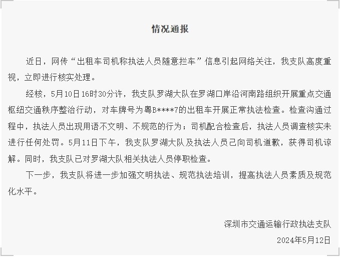 經(jīng)核,5月10日16時30分許,深圳市交通運(yùn)輸行政執(zhí)法支隊羅湖大隊在羅湖口岸沿河南路組織開展重點(diǎn)交通樞紐交通秩序整治行動,對車牌號為粵B****7的出租車開展正常執(zhí)法檢查。檢查溝通過程中,執(zhí)法人員出現(xiàn)用語不文明、不規(guī)范的行為;司機(jī)配合檢查后,執(zhí)法人員調(diào)查核實未進(jìn)行任何處罰。5月11日下午,深圳市交通運(yùn)輸行政執(zhí)法支隊羅湖大隊及執(zhí)法人員己向司機(jī)道歉,獲得司機(jī)諒解。同時,深圳市交通運(yùn)輸行政執(zhí)法支隊已對羅湖大隊相關(guān)執(zhí)法人員停職檢查。