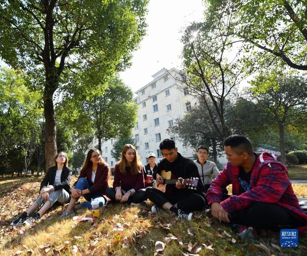作為中俄交換生在江西省華東交通大學(xué)就讀的俄羅斯姑娘米卡科娃·娜塔莉亞(左三)在學(xué)校欣賞同學(xué)彈奏(2019年10月31日攝)。新華社記者 胡晨歡 攝