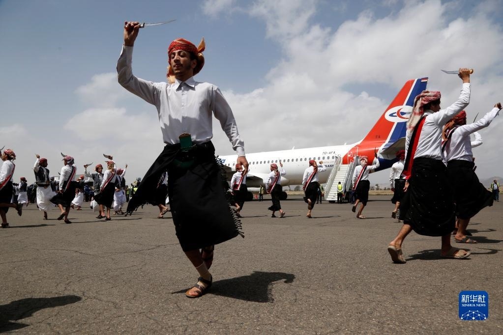 4月15日,在也門薩那機場,人們在歡迎戰(zhàn)俘歸來的儀式上跳舞。
