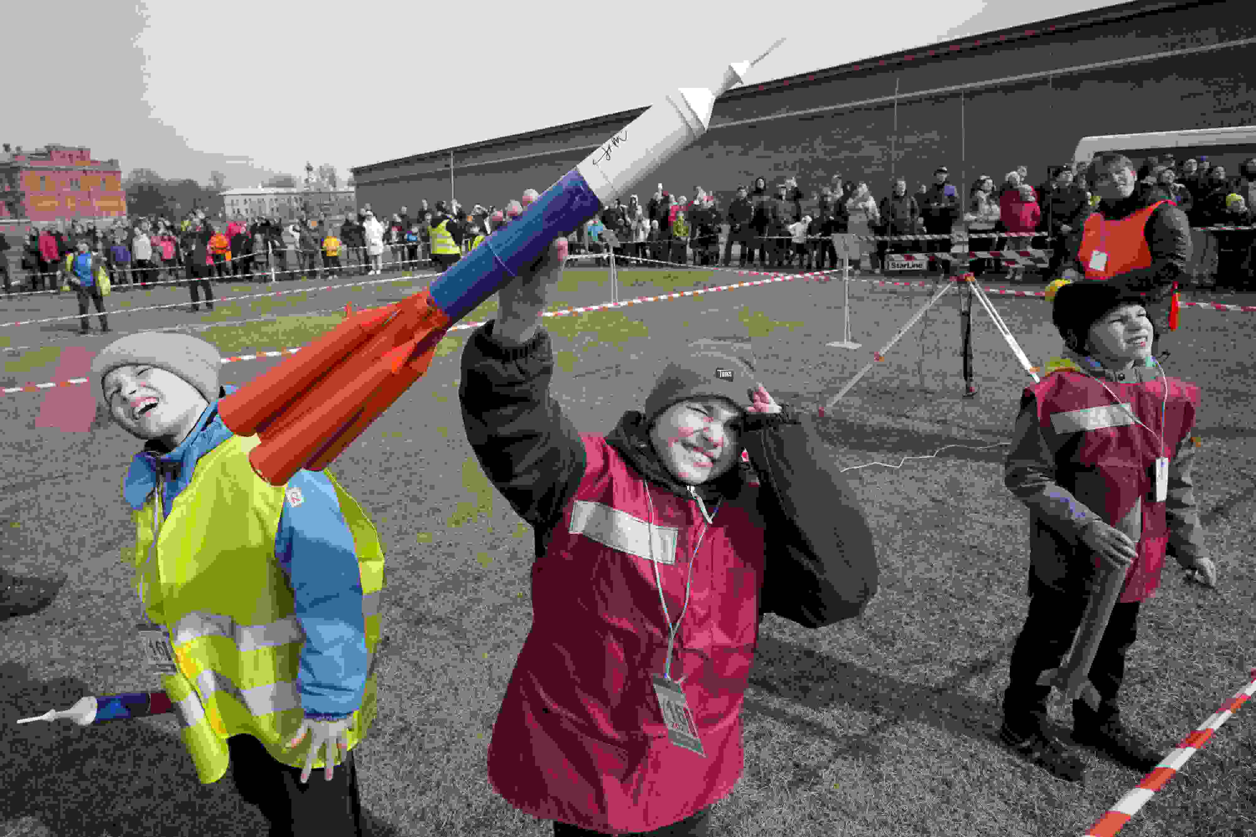 當(dāng)?shù)貢r(shí)間2023年4月16日,俄羅斯圣彼得堡,民眾發(fā)射火箭模型紀(jì)念人類首次太空飛行62周年。 視覺中國(guó)