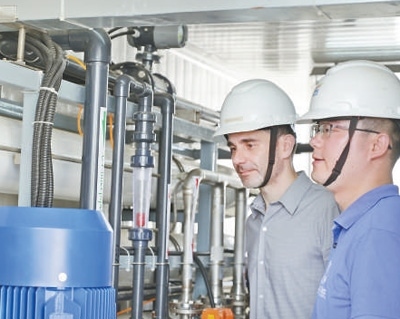 在巴西北里奧格蘭德州若昂卡馬拉市,中國(guó)國(guó)家電網(wǎng)巴西電力股份公司員工在檢查凈水設(shè)備。該苦咸水淡化公益項(xiàng)目讓800多個(gè)家庭喝上優(yōu)質(zhì)飲用水。 新華社記者 陳昊佺攝
