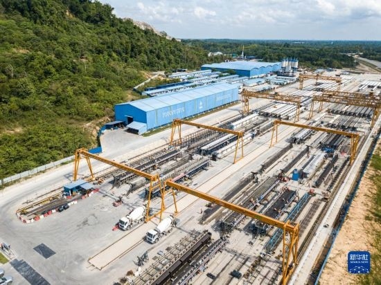 這是4月26日在馬來西亞吉蘭丹州拍攝的馬東鐵項目一分部制梁場(無人機(jī)拍攝)。新華社記者 朱煒 攝