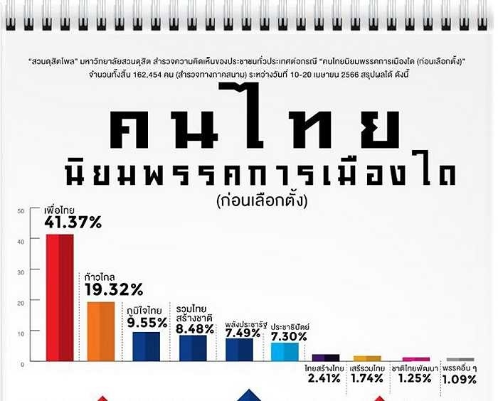 泰國川登喜大學民意調(diào)查研究機構(gòu)統(tǒng)計顯示,為泰黨在選民中的支持率為41.37%,遙遙領(lǐng)先于前進黨的19.32%和泰國人團結(jié)建國黨的8.48%。巴維所在的國民力量黨僅7.49%。
