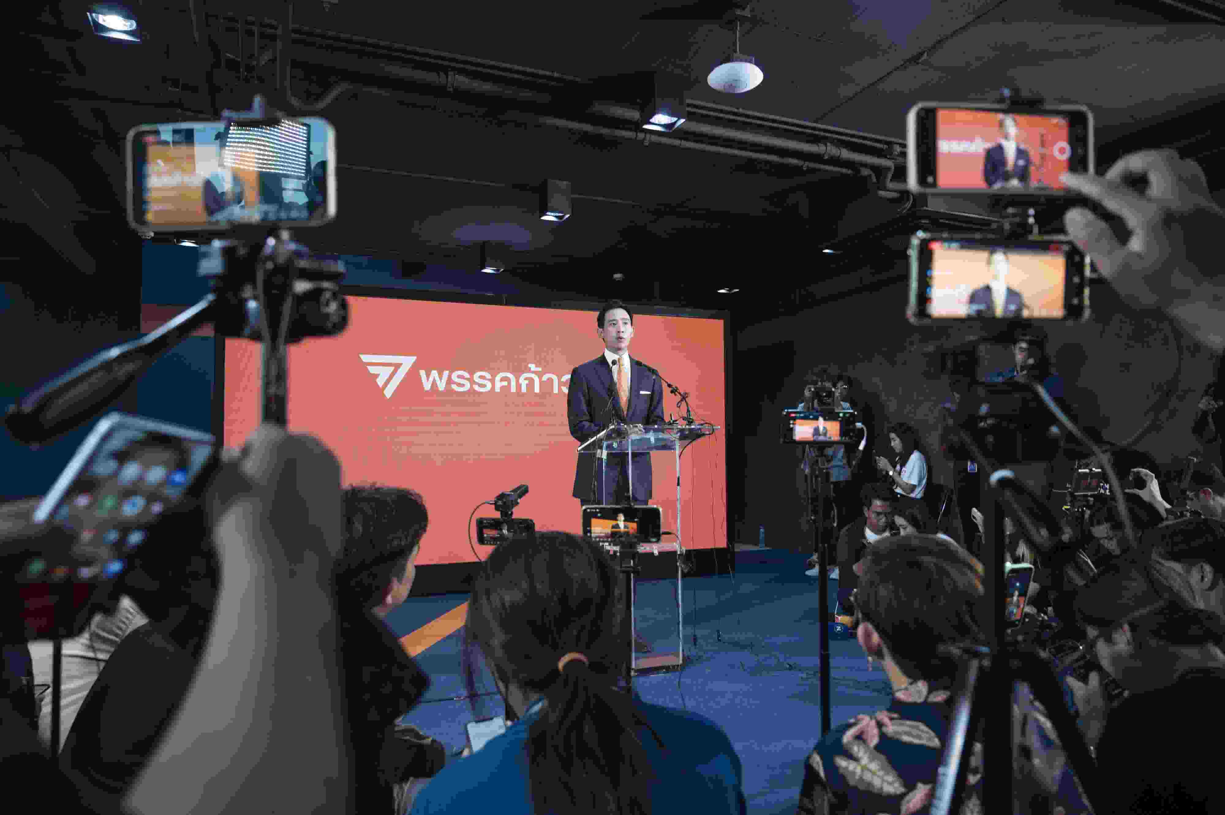 當?shù)貢r間2023年5月15日,泰國曼谷,泰國遠進黨黨魁皮塔在該黨總部舉行記者招待會。當日中午,在泰國國會下議院選舉中獲得選票數(shù)和下議院席位數(shù)暫時領先的遠進黨黨魁皮塔宣布遠進黨在此次選舉中獲勝,已經(jīng)做好組建新一屆政府的準備,自己也已準備好擔任總理一職。 視覺中國