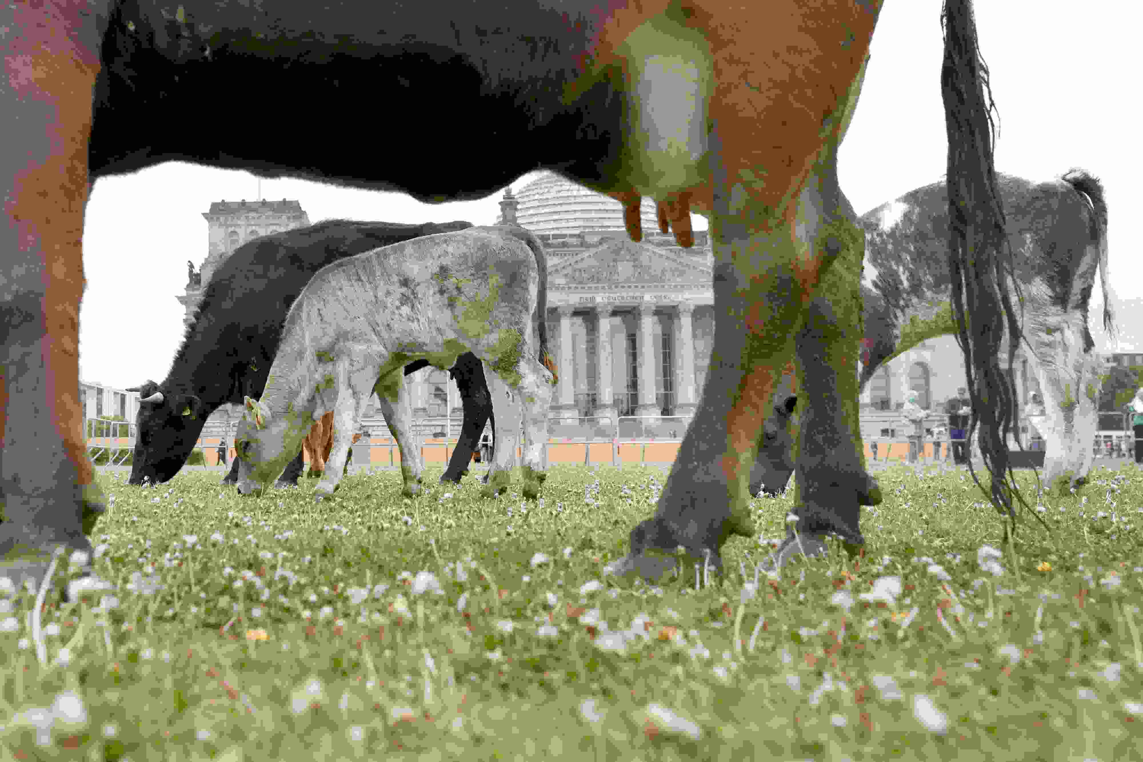 當(dāng)?shù)貢r間2023年5月16日,德國柏林,牛群被驅(qū)趕到國會大廈前吃草。活動組織者希望通過這一行動,呼吁政治家們采取更多措施來促進牧場農(nóng)業(yè)。 視覺中國