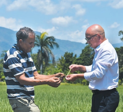 中國農(nóng)業(yè)專家(右)和當?shù)貙<以诙嗝啄峒訃宜九嘤栔行挠懻撍痉N植問題。 新華社記者 朱婉君攝