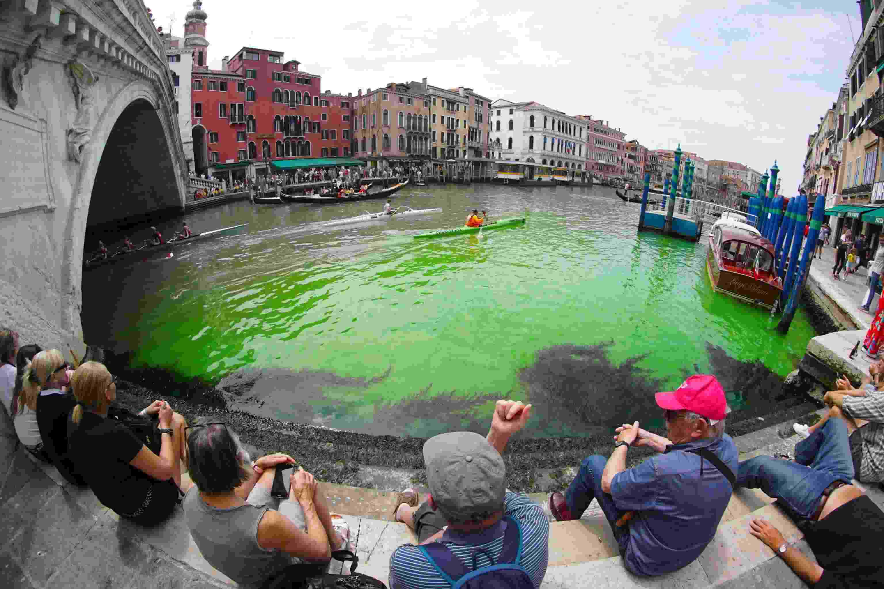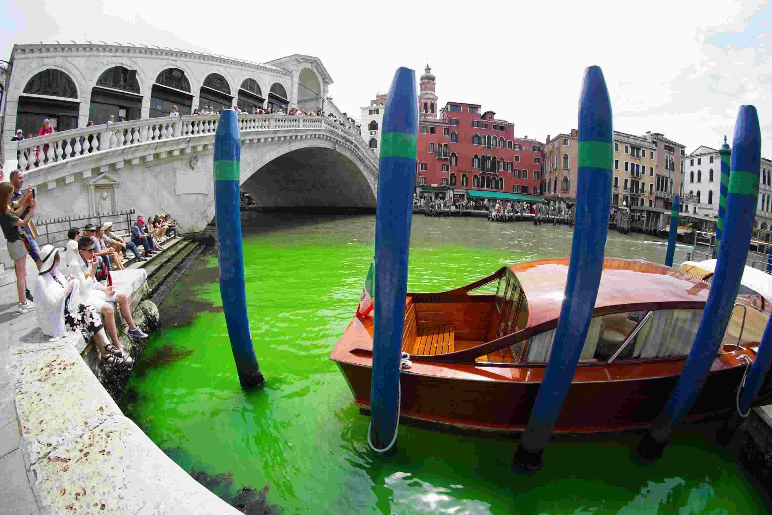 當(dāng)?shù)貢r間2023年5月28日,意大利威尼斯大運河里亞托橋附近水域變成了熒光綠的顏色,警方等部門已經(jīng)介入調(diào)查,尋找原因。 視覺中國