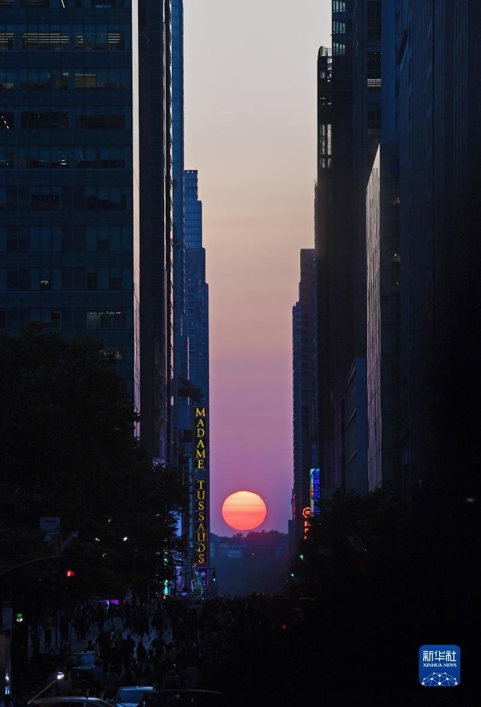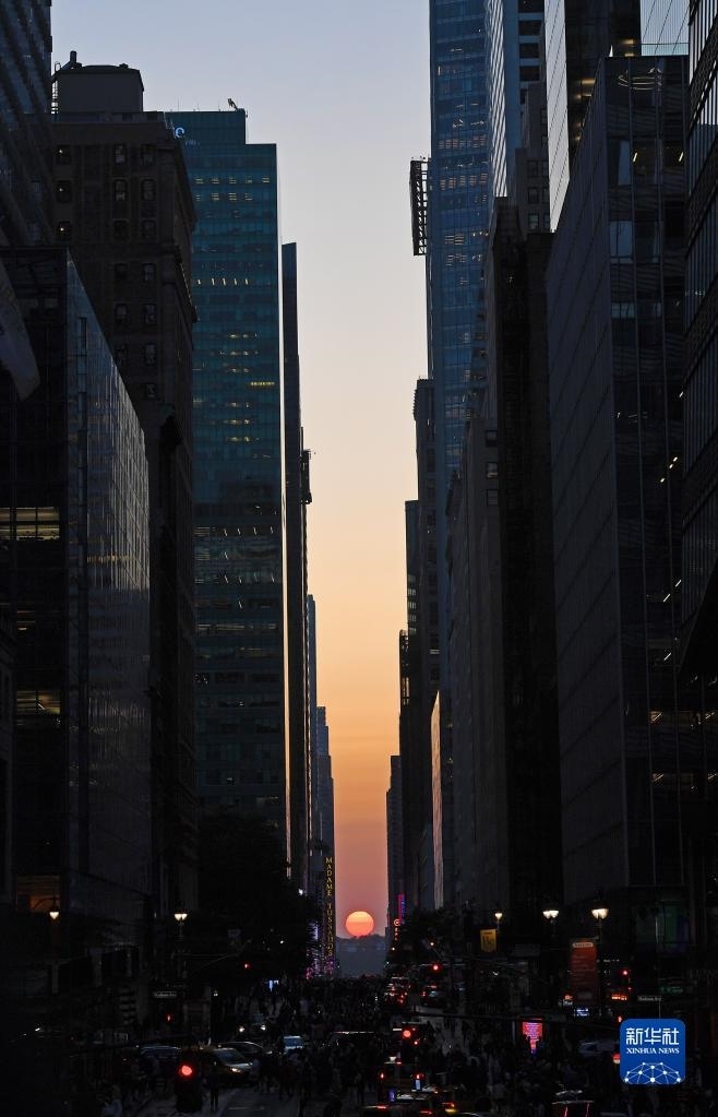 當(dāng)日,紐約出現(xiàn)“曼哈頓懸日”景觀?!奥D懸日”是紐約市標(biāo)志性景觀,每年5月和7月出現(xiàn)兩次,指日落時太陽正好出現(xiàn)在曼哈頓東西向街道正上方、似乎懸在兩側(cè)高樓大廈之間的戲劇性畫面。新華社記者 李睿 攝