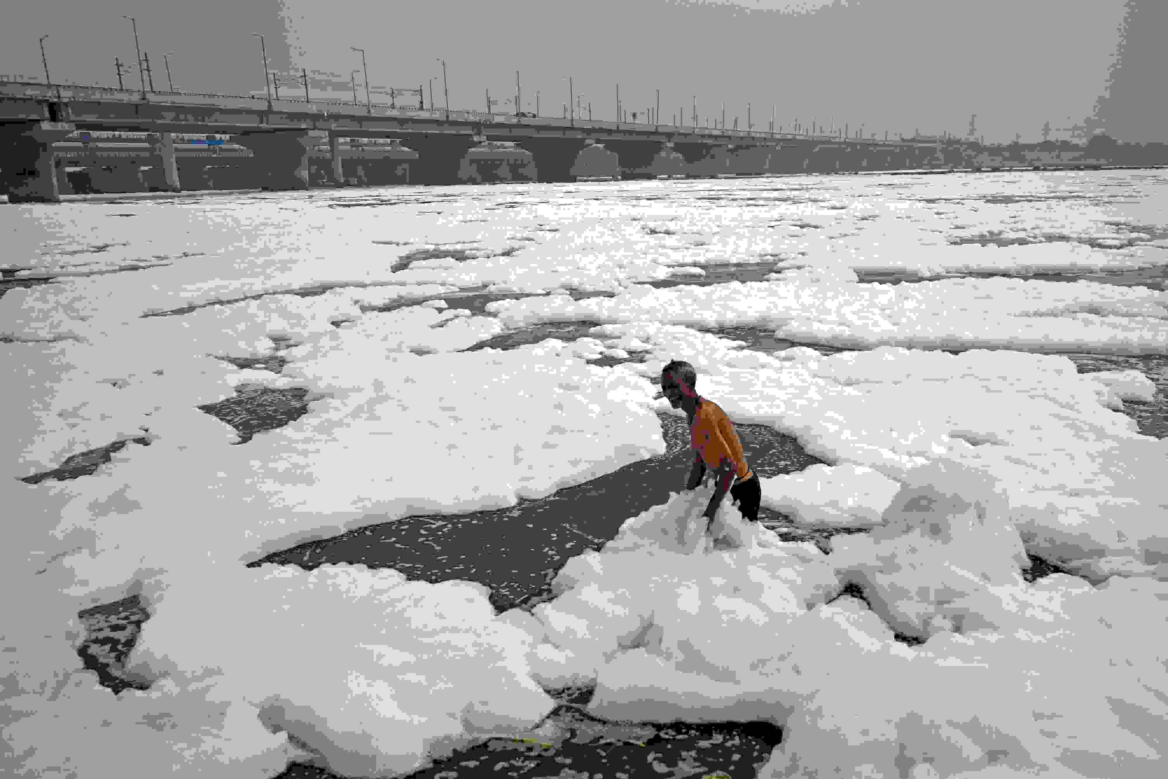 當?shù)貢r間2023年6月4日,印度新德里,世界環(huán)境日前夕,人們在充滿有毒泡沫的亞穆納河中沐浴。 視覺中國
