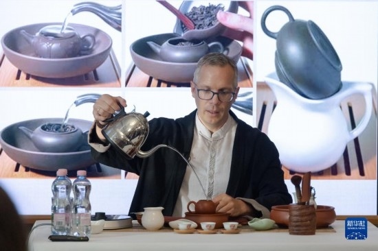 6月1日,在匈牙利布達(dá)佩斯,一名茶文化愛好者在“茶和天下·雅集”活動(dòng)上向嘉賓展示沖泡中國(guó)茶。新華社發(fā)(弗爾季·奧蒂洛攝)