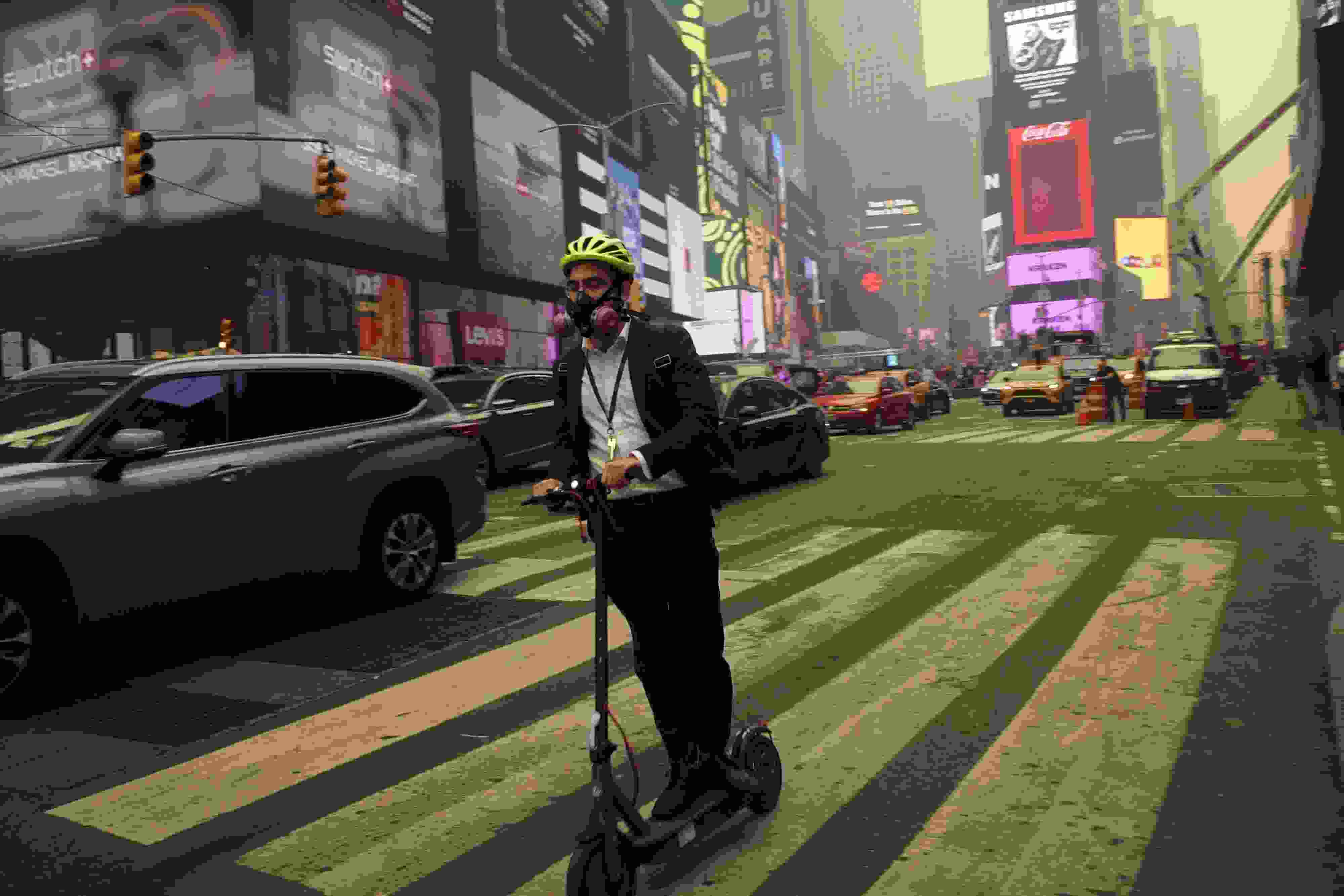 當(dāng)?shù)貢r間6月7日,美國紐約時報廣場的一位騎行者佩戴著呼吸過濾器。近日,加拿大野火產(chǎn)生的煙霧蔓延至美國,紐約市出現(xiàn)霧霾,戶外民眾嚴密防護。 視覺中國