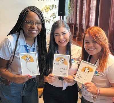 拉美青年代表展示自己學習創(chuàng)作的葉畫作品。本報記者 姜 波攝