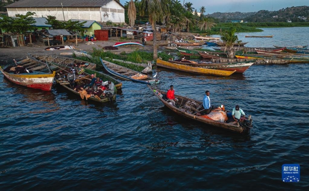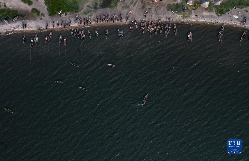 這是6月14日拍攝的坦桑尼亞姆萬扎省維多利亞湖畔的漁船(無人機照片)。