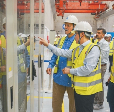 巴基斯坦卡洛特水電站是中巴經(jīng)濟(jì)走廊首個(gè)水電投資項(xiàng)目,由中國(guó)三峽集團(tuán)投資開(kāi)發(fā)建設(shè),運(yùn)營(yíng)一年來(lái)節(jié)約標(biāo)準(zhǔn)煤約140萬(wàn)噸,減少二氧化碳排放約350萬(wàn)噸。圖為中方技術(shù)人員向來(lái)訪的巴基斯坦代表團(tuán)介紹水電站運(yùn)行情況。本報(bào)巴基斯坦分社 薩義德·邁赫迪攝