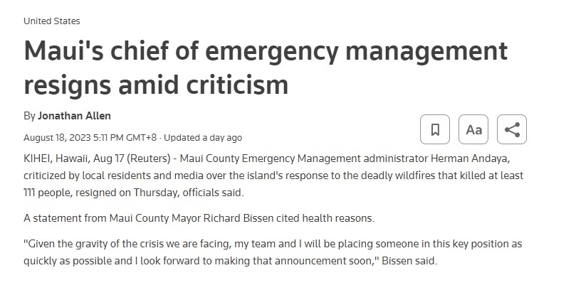 路透社8月18日報道,毛伊縣緊急事務(wù)管理機(jī)構(gòu)負(fù)責(zé)人赫爾曼·安達(dá)亞在當(dāng)?shù)鼐用窈兔襟w的一片“救災(zāi)不利”的譴責(zé)聲中辭職。截至17日,致命山火已經(jīng)造成至少111人死亡。一些毛伊島居民認(rèn)為,如果能更早拉響警報,會挽救更多生命。