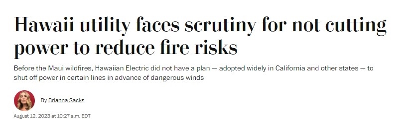 據(jù)《華盛頓郵報》8月12日報道,三家法律公司已代表受害者對夏威夷電氣公司提起集體訴訟,指控該公司未在強風(fēng)天氣來臨前切斷供電。該公司下屬的一個變電站8日曾出現(xiàn)電線倒塌事故,事發(fā)地點靠近最初起火點。