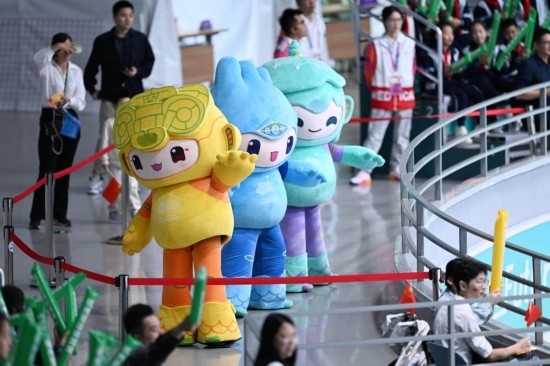 10月7日,杭州亞運(yùn)會(huì)吉祥物在女子花樣輪滑單人滑比賽前的暖場(chǎng)活動(dòng)中。新華社記者 陳曄華 攝
