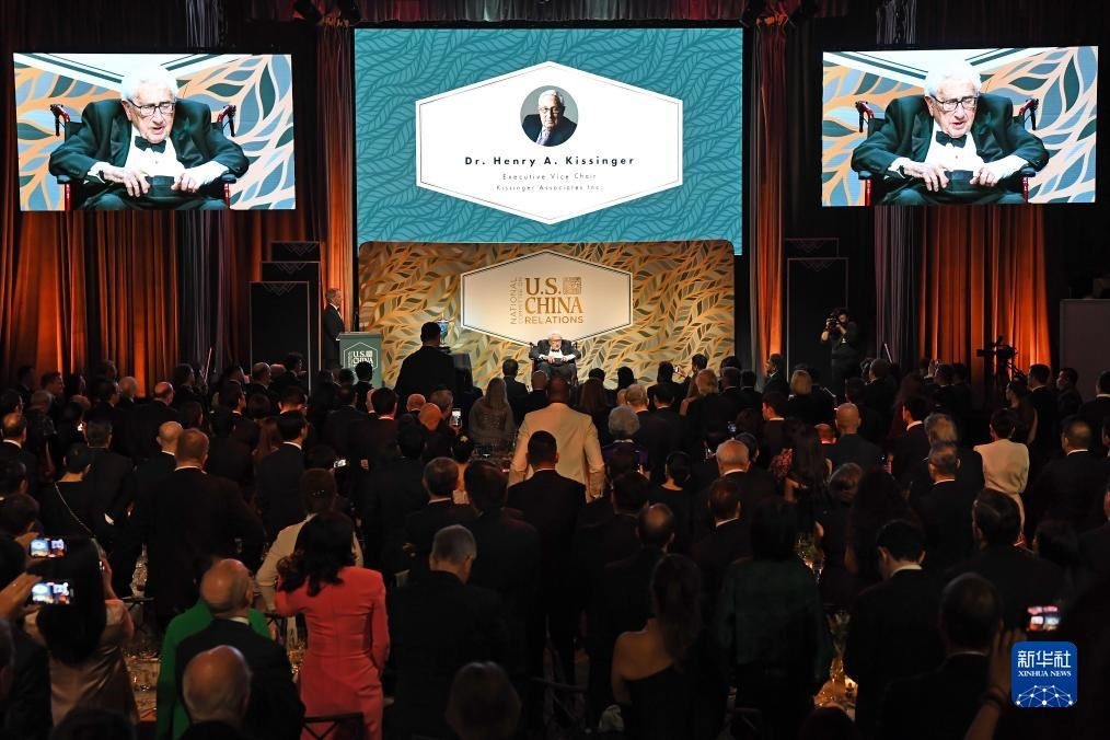 10月24日,美國(guó)前國(guó)務(wù)卿基辛格(中)在紐約舉行的美中關(guān)系全國(guó)委員會(huì)年度頒獎(jiǎng)晚宴上講話(huà)。新華社記者 李睿 攝