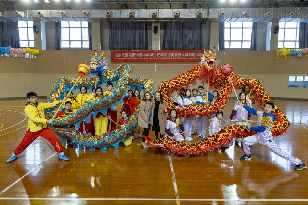 1月29日,馬斯卡廷學(xué)生在上海參加舞龍體驗活動。