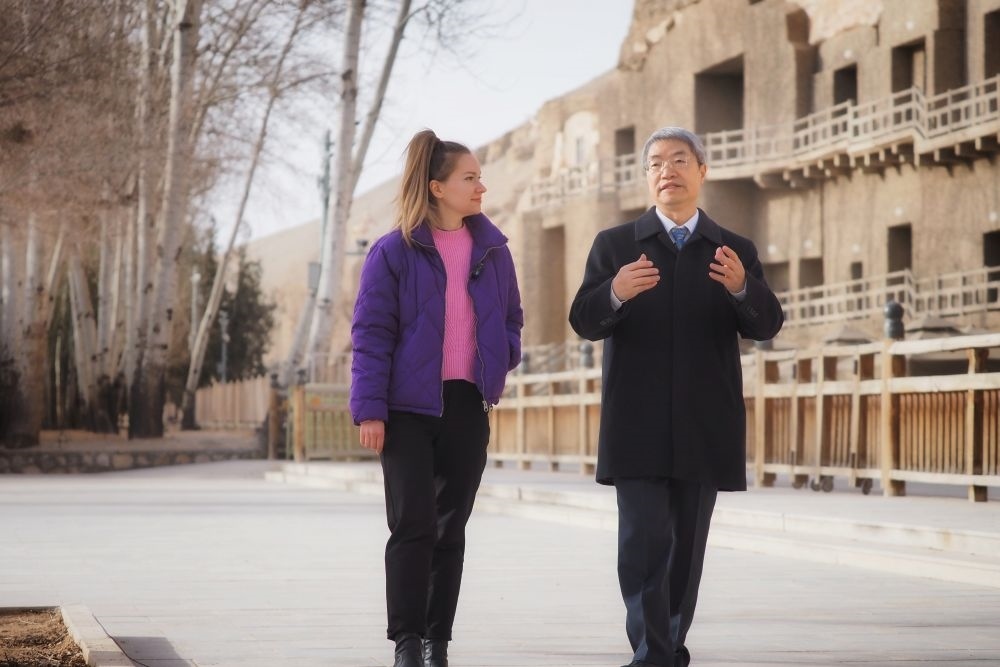 3月16日,新華社外籍記者達(dá)莎在莫高窟前同敦煌研究院黨委書記趙聲良交流。新華社記者趙宇攝
