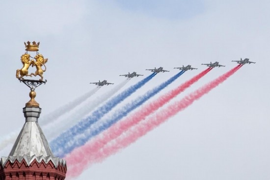 5月9日,在俄羅斯首都莫斯科,蘇-25攻擊機編隊在紅場上空飛過。新華社記者白雪騏攝