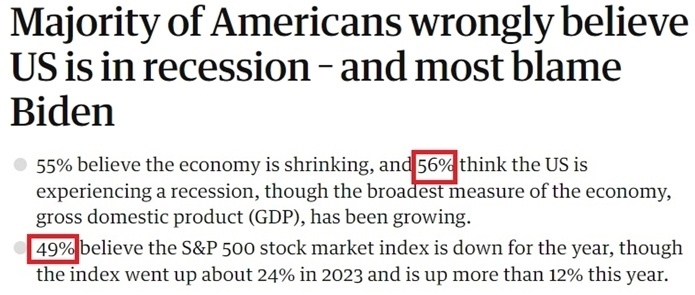 眼下美國的經(jīng)濟現(xiàn)狀,被經(jīng)濟學家們稱為“氛圍衰退”。這個詞最早由網(wǎng)紅經(jīng)濟評論員凱拉 斯坎倫創(chuàng)造,用以描述人們對經(jīng)濟狀況存在的悲觀情緒,即便是表現(xiàn)良好的經(jīng)濟統(tǒng)計數(shù)據(jù)也無法消除這種悲觀情緒。