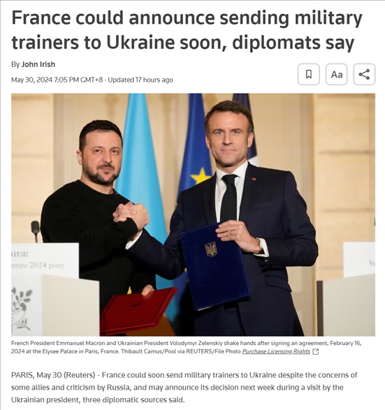 5月30日,路透社援引三位匿名外交消息人士稱(chēng),盡管仍有顧慮,但法國(guó)可能很快會(huì)向?yàn)蹩颂m派遣軍事教官,并可能在下周烏克蘭總統(tǒng)訪(fǎng)問(wèn)期間宣布這一決定。