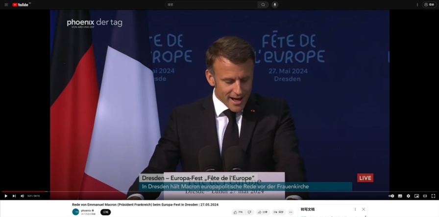 Phoenix在其YouTube頻道上播出的馬克龍演講的完整版本截圖。網(wǎng)傳視頻顯示的音頻內(nèi)容與Phoenix播出的馬克龍?jiān)诘吕鬯诡D進(jìn)行演講時(shí)開(kāi)篇的音頻一致,且拍攝現(xiàn)場(chǎng)的環(huán)境高度吻合。