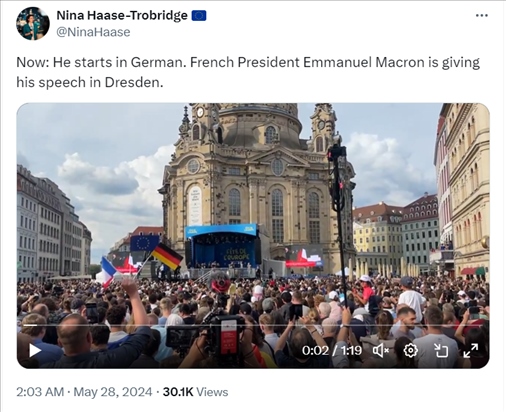 X平臺(tái)用戶(hù)@NinaHaase在28日凌晨2點(diǎn)03分發(fā)布的推文截圖,稱(chēng)“現(xiàn)在,法國(guó)總統(tǒng)埃馬紐埃爾·馬克龍正在德累斯頓發(fā)表演講,他開(kāi)場(chǎng)用了德語(yǔ)”,沒(méi)有提到法國(guó)軍隊(duì)。