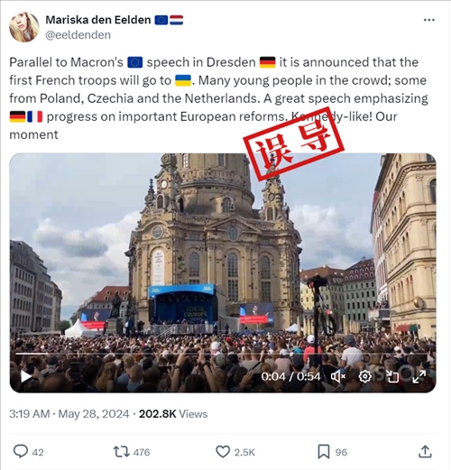視頻顯示的內(nèi)容系馬克龍?jiān)谘葜v開(kāi)篇用德語(yǔ)對(duì)現(xiàn)場(chǎng)來(lái)賓進(jìn)行問(wèn)候,未提到法國(guó)軍隊(duì)。核查馬克龍?jiān)诘吕鬯诡D的演講內(nèi)容發(fā)現(xiàn),在近40分鐘的演講期間,馬克龍共有16次提到“烏克蘭”,但其中沒(méi)有內(nèi)容是與向?yàn)蹩颂m派遣法國(guó)軍隊(duì)相關(guān)的。