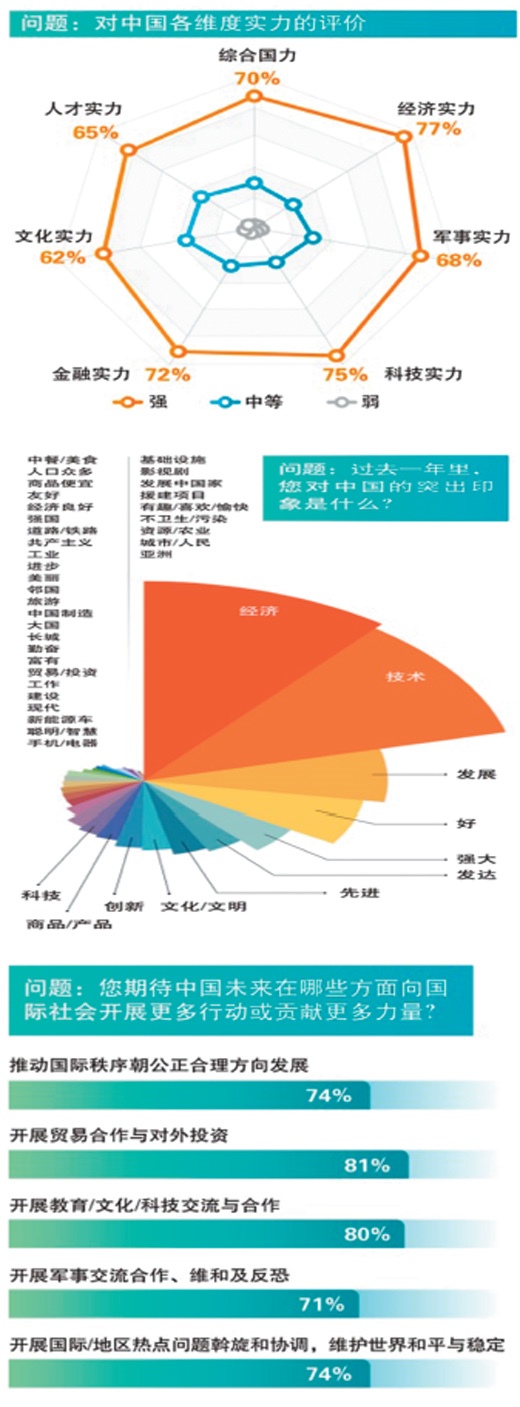 調(diào)查問卷讓被訪者自主描繪其過去一年里對中國的突出印象。報告顯示,各國民眾使用率最高的關(guān)鍵詞包括“經(jīng)濟”“技術(shù)/科技”“發(fā)展/發(fā)達”“好”“強大/強國”“先進/創(chuàng)新”“文化/文明”“商品/產(chǎn)品”“人口眾多”“中餐/美食”等。在發(fā)達國家、歐洲國家、中東國家和東盟國家,“經(jīng)濟”被提及的頻次居首;在發(fā)展中國家、非洲國家、金磚國家,“技術(shù)”被提及的頻次最高。