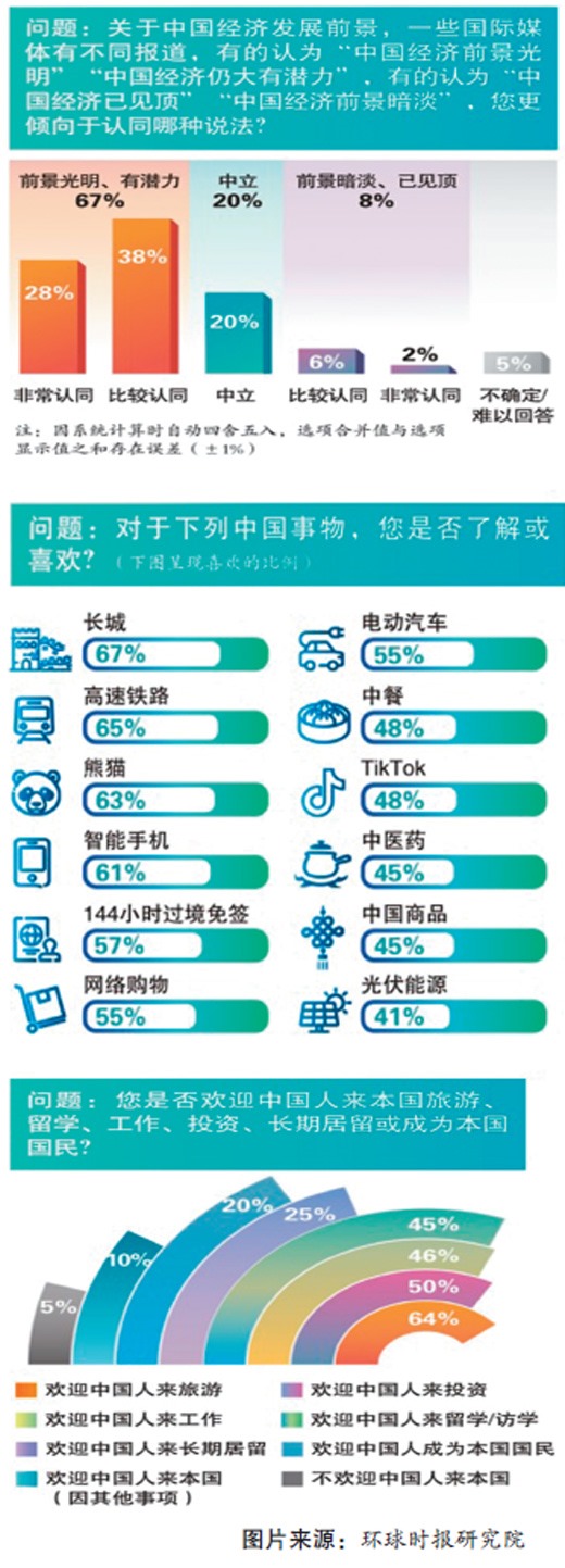 本次調(diào)查還列舉了10余項有代表性的中國事物,并逐一向國外民眾詢問喜愛與否。其中,長城(67%)、高鐵(65%)、熊貓(63%)、智能手機(61%)的獲喜愛比例超過六成,過境免簽(57%)、電動汽車(55%)和網(wǎng)絡購物(55%)的獲喜愛比例超過半數(shù),中餐(48%)和TikTok(48%)的獲喜愛比例接近半數(shù)。