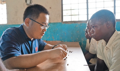 中國專家向姆坦噶尼小學(xué)學(xué)生講解血吸蟲病防治知識(shí)。