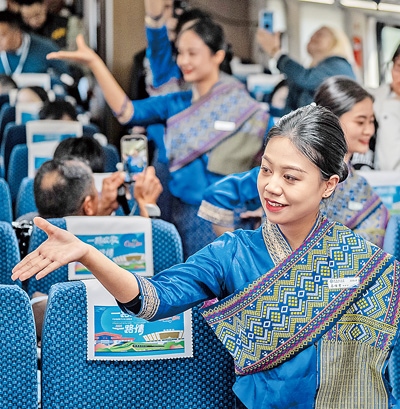1月14日,中國鐵路昆明局集團(tuán)有限公司“金花列車員”在D87次中老鐵路國際旅客列車上表演節(jié)目。