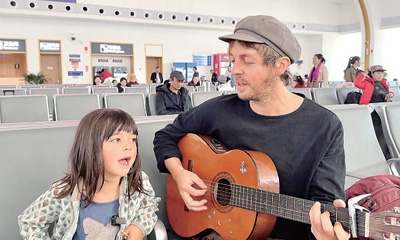西雙版納站,喬納森和孩子在候車時一起彈唱。