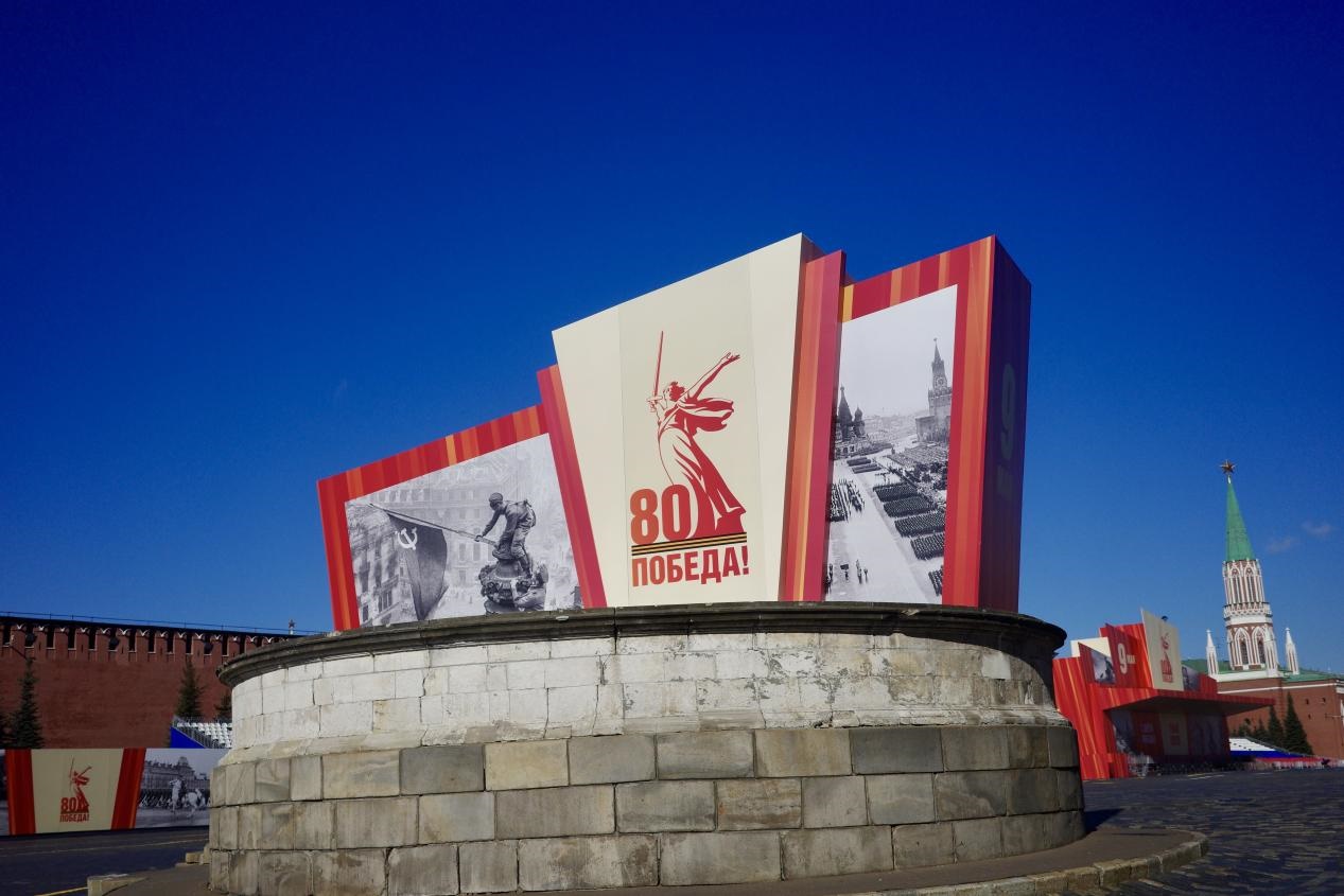 當(dāng)?shù)貢r(shí)間5月6日,俄羅斯國(guó)家歷史博物館前擺放紀(jì)念蘇聯(lián)偉大衛(wèi)國(guó)戰(zhàn)爭(zhēng)勝利80周年慶典旗幟。 鄺西曦 攝