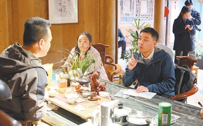本報(bào)記者在李家大院采訪李孔(左一)。