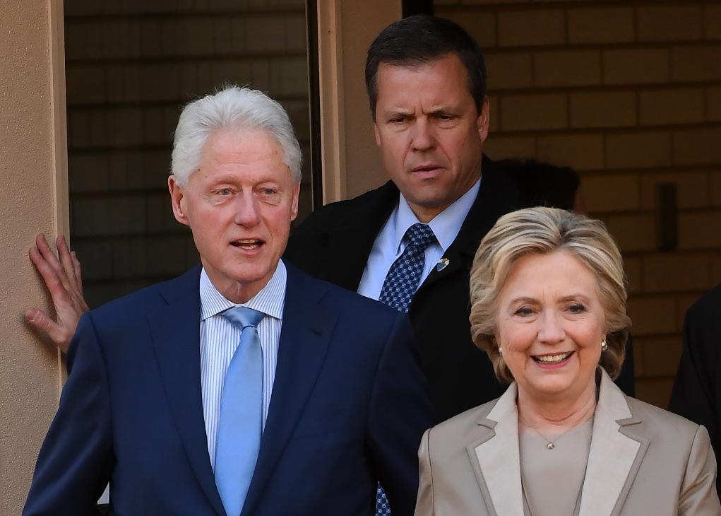 2016年11月8日,在美國(guó)紐約州查帕闊一處投票站,民主黨總統(tǒng)候選人希拉里·克林頓(前右)與她的丈夫、前總統(tǒng)比爾·克林頓(前左)參加大選投票。新華社記者殷博古攝