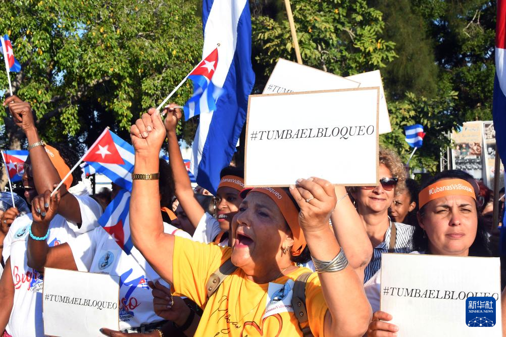 4月7日,在古巴首都哈瓦那,婦女們在集會現(xiàn)場手持“推翻封鎖”的橫幅和古巴國旗,譴責(zé)美國對古封鎖。新華社發(fā)(華金·埃爾南德斯攝)
