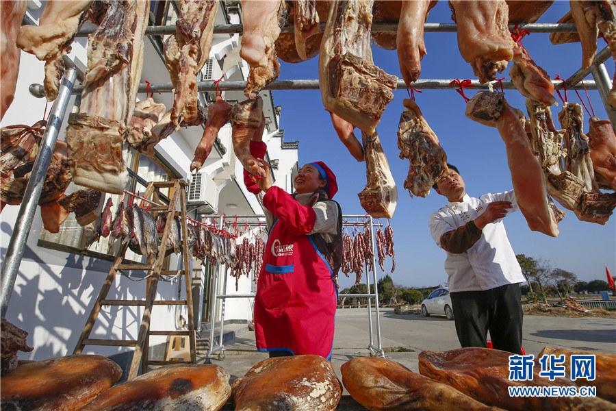 隨著春節(jié)臨近,安徽省黃山市徽州區(qū)西溪南鎮(zhèn)村民開始制作徽州傳統(tǒng)臘味,腌制火腿、臘肉,灌制香腸,并進(jìn)行晾曬。臘味飄香,年味漸濃,制作、晾曬傳統(tǒng)臘味成為徽州一道獨(dú)特風(fēng)景。新華網(wǎng)發(fā)(施亞磊攝)
