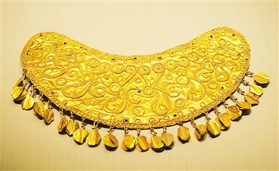 展廳里有不少光彩照人的漢代金飾品,體現(xiàn)了多元文明的融匯。一套出土于鄂爾多斯的金鑲貝玉首飾,由長方形鹿紋金飾牌、方形嵌蚌金串飾、包金玉佩等組成,其中的鹿紋是典型的草原風(fēng)格紋飾,嵌蚌及其周圍的連珠紋工藝則具有波斯等西方文明的工藝特征。一塊出土于通遼的金飾牌,是薩滿主持祭祀活動時(shí)佩戴的飾件,中間雕有一高鼻深目、頭戴尖頂帽的女性,兩側(cè)各有一只怪獸,與西伯利亞地區(qū)出土的雙獅守護(hù)圣樹金飾牌極為相似。