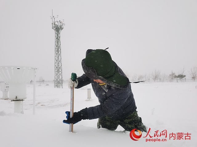 通遼市庫倫旗氣象局觀測(cè)場(chǎng)工作人員進(jìn)行加密雪深觀測(cè)。白向陽攝