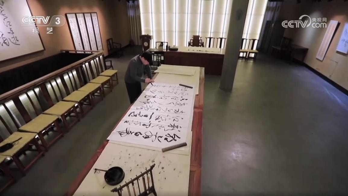 中國書法家協(xié)會(huì)草書專業(yè)委員會(huì)副主任、上海市書法家協(xié)會(huì)主席 丁申陽:武打的場面,他(導(dǎo)演)說后面一堵墻,你可以用草書來書寫,掛在后面作背景。他說這個(gè)草書跟武術(shù)其實(shí)有相同點(diǎn),都是動(dòng)態(tài)的美,也有左右避讓的關(guān)系,長短的協(xié)調(diào)的關(guān)系,還有重輕的關(guān)系,矛盾平衡之間尋找一個(gè)點(diǎn),這個(gè)點(diǎn)就是協(xié)調(diào),協(xié)調(diào)就是美的。