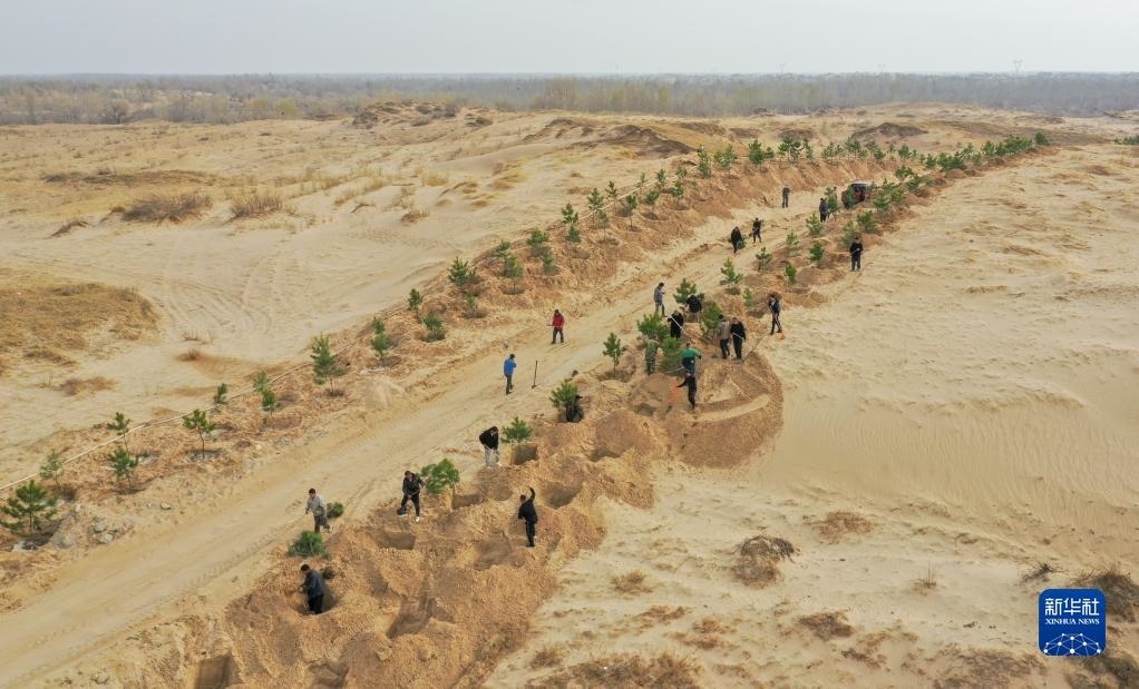 4月15日,在內蒙古通遼市科爾沁左翼后旗,治沙工人在科爾沁沙地植樹造林。
